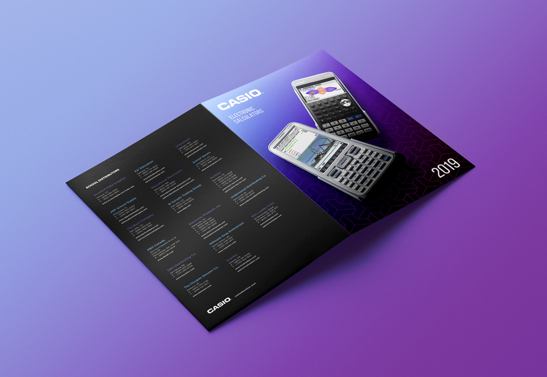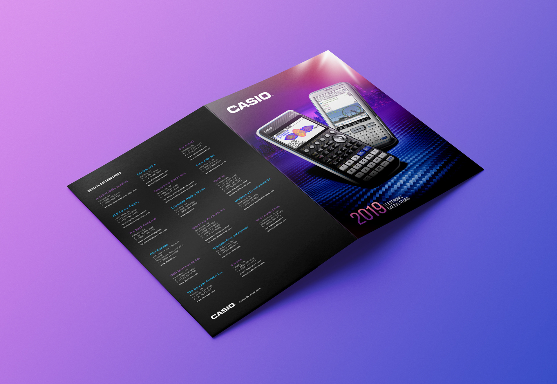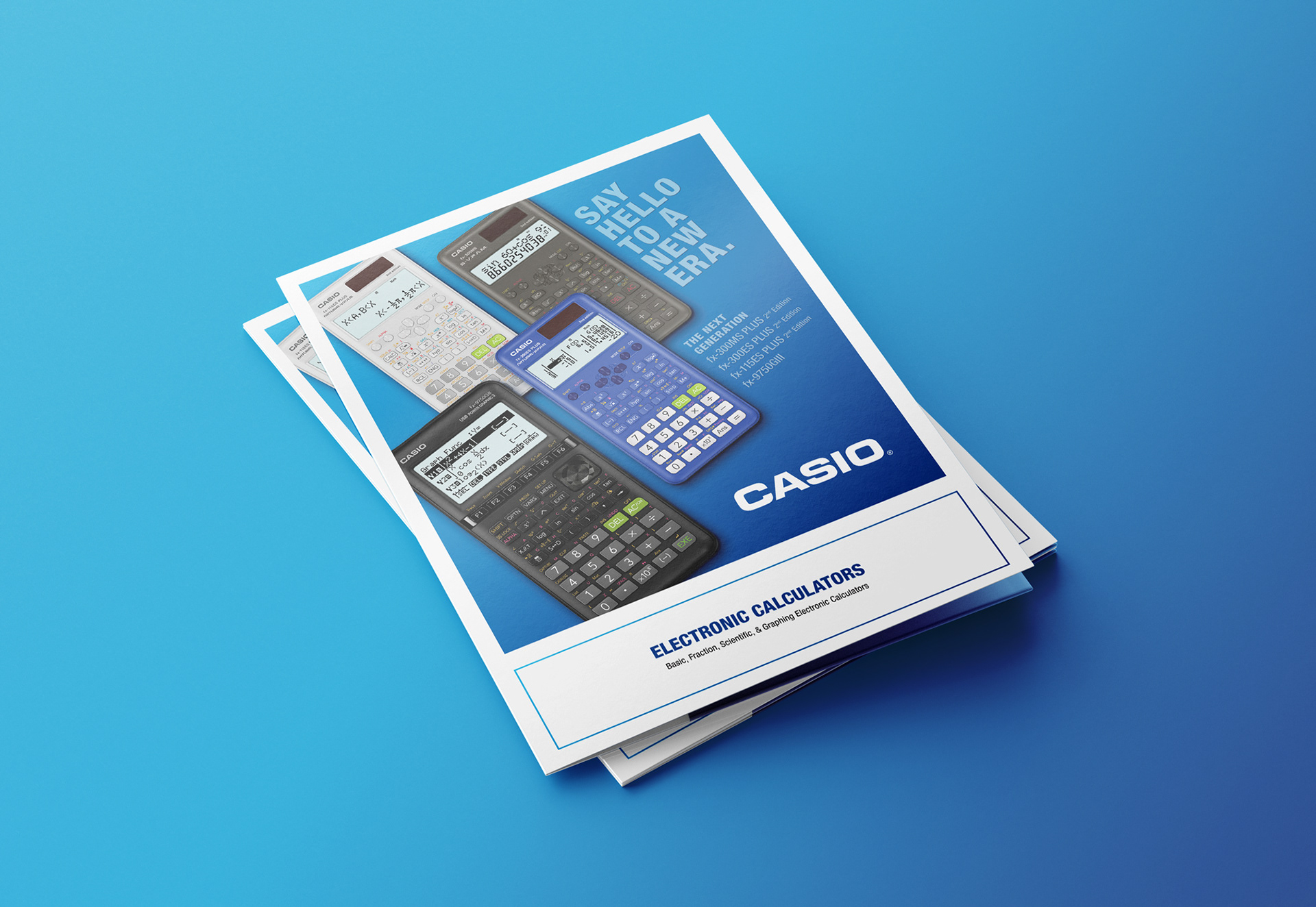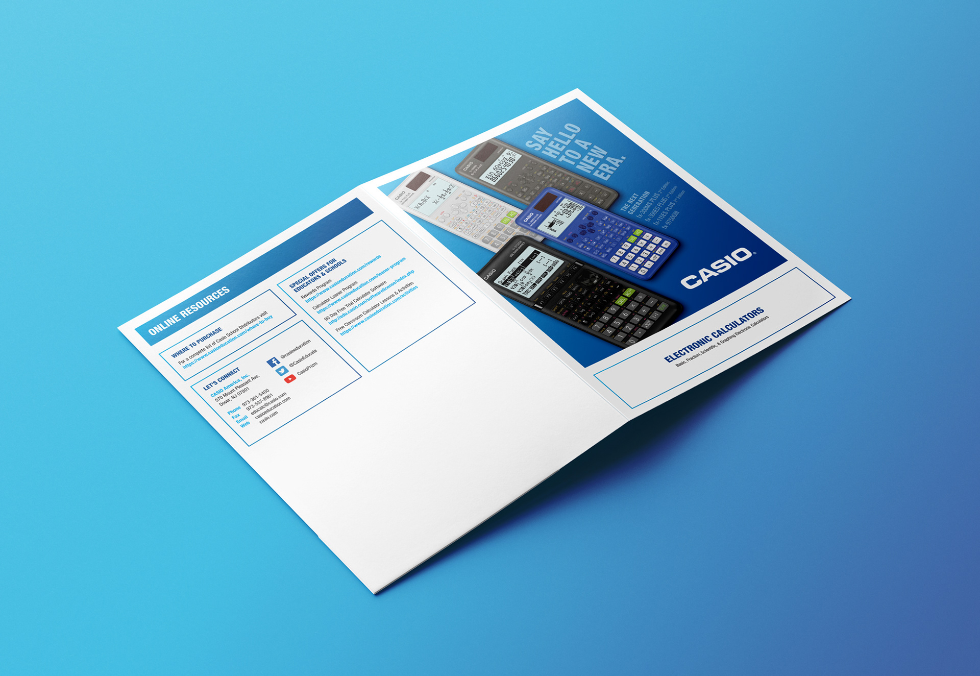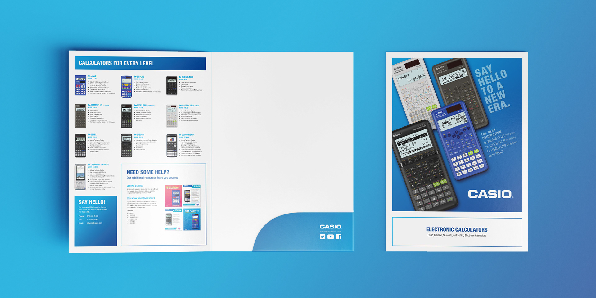 Concepts for single pocket sales folder for CASIO Education, featuring current products and resources