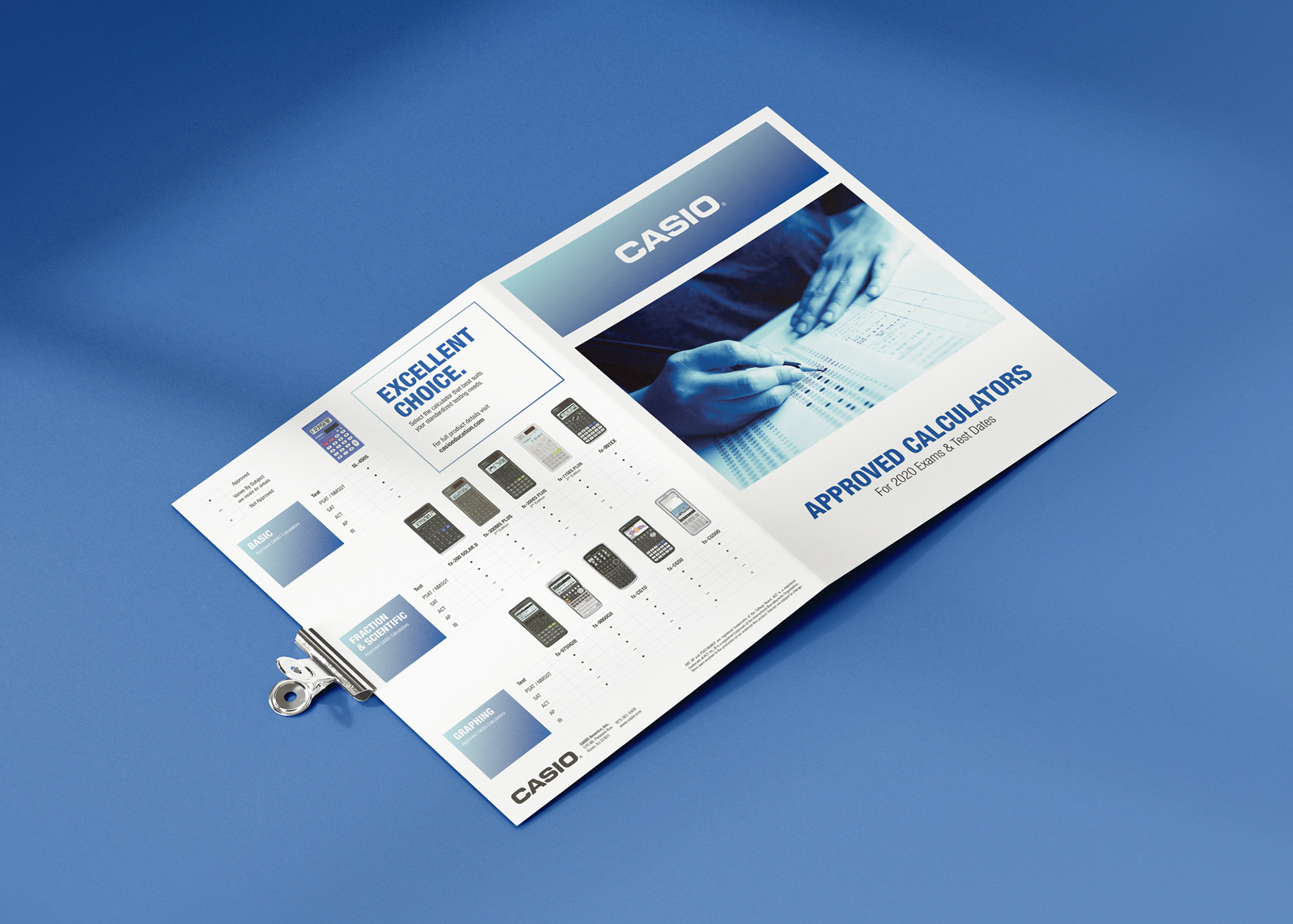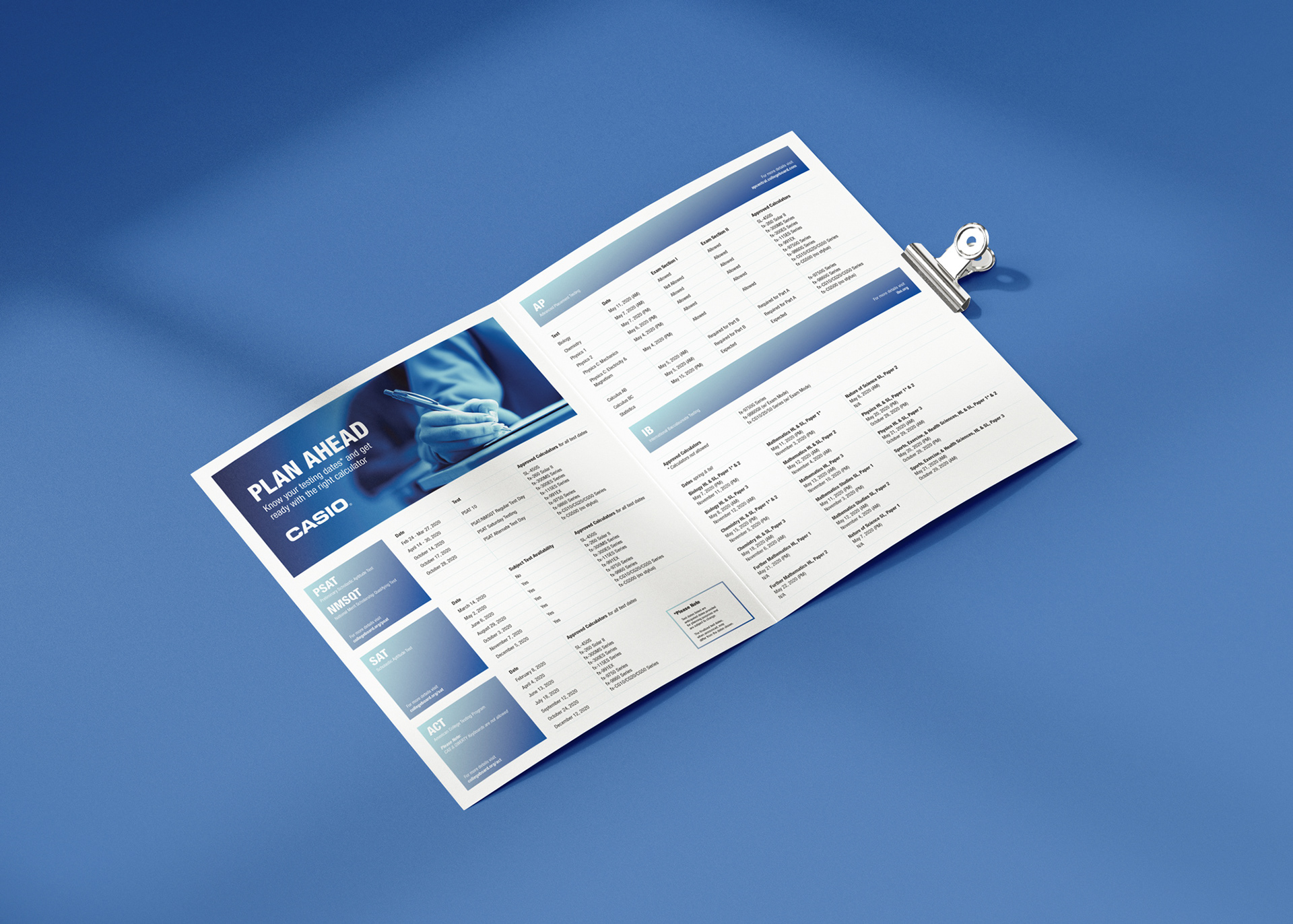 Bifold brochure detailing standardized testing dates and approved CASIO Education calculators