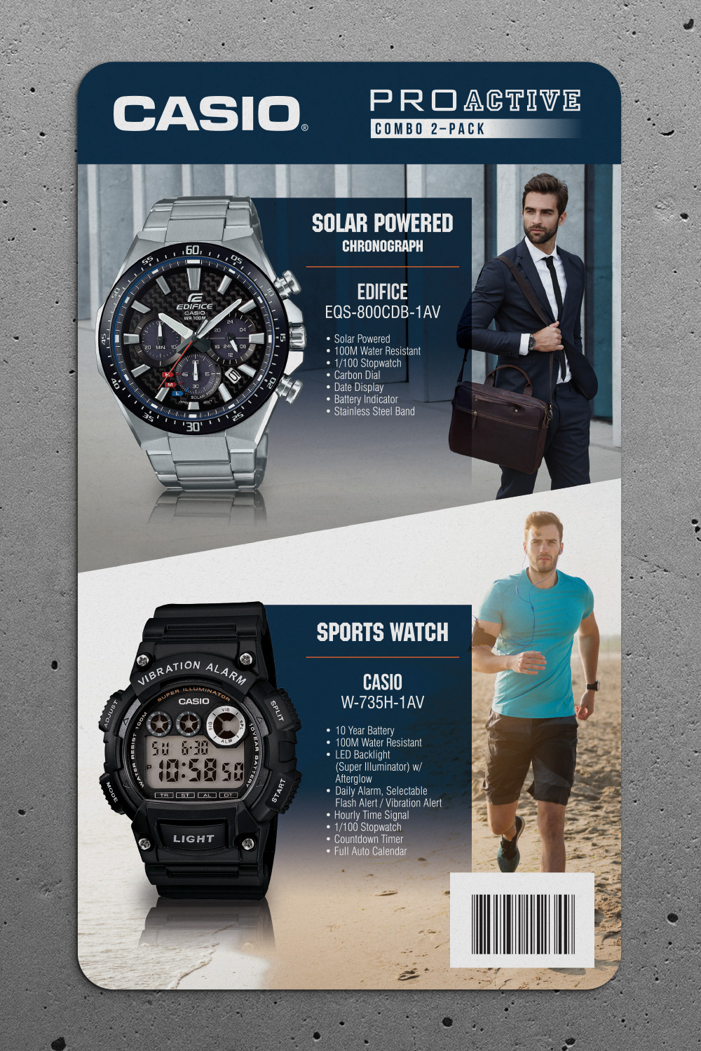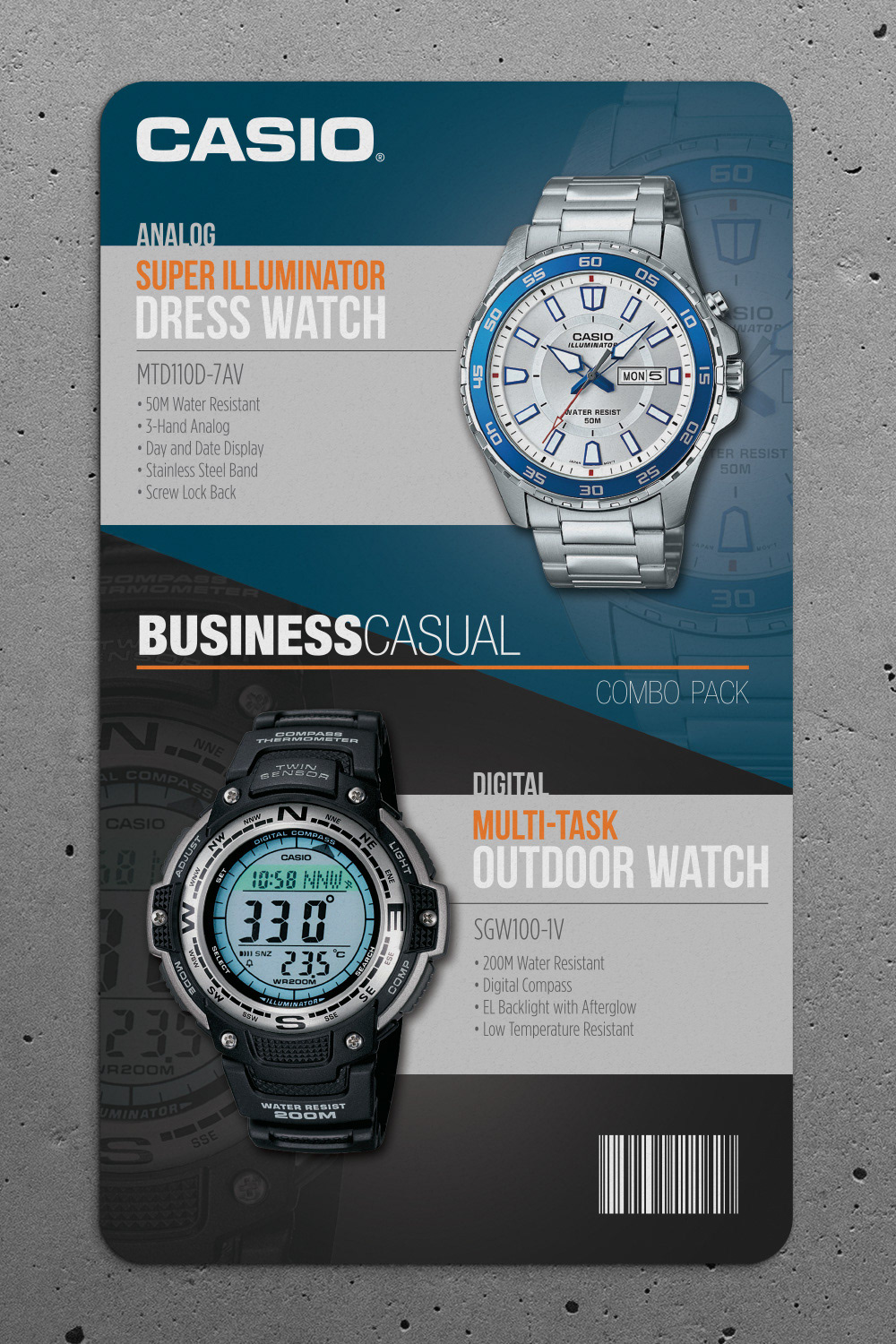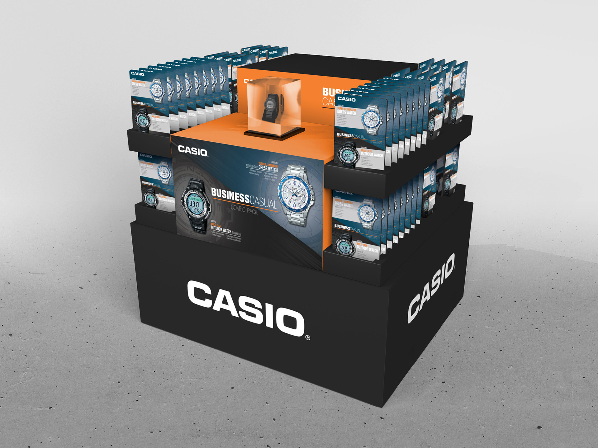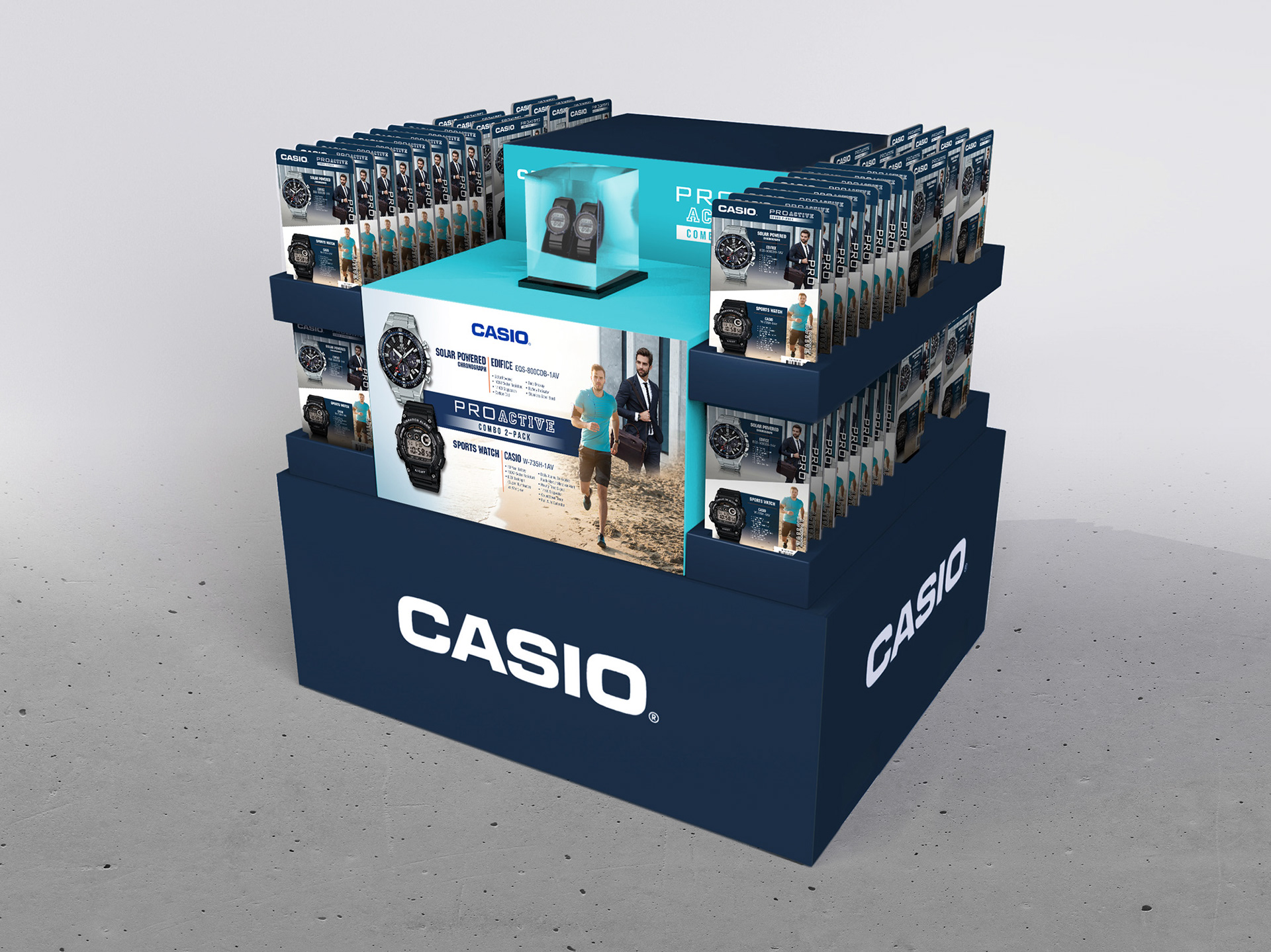 Concepts for a pull card style pallet display, featuring a combo pack of CASIO core timepieces