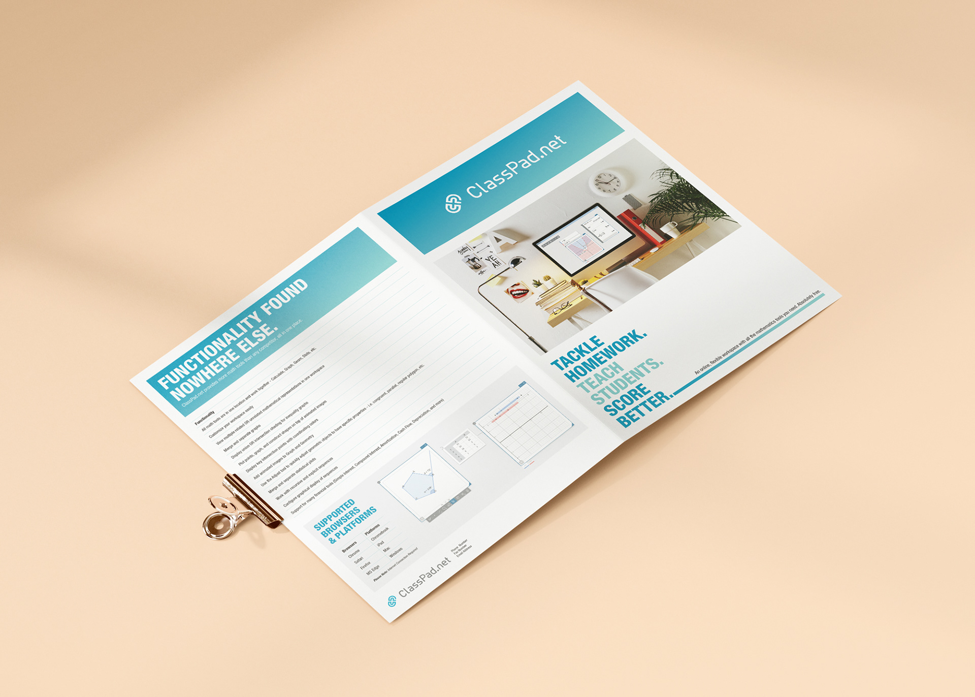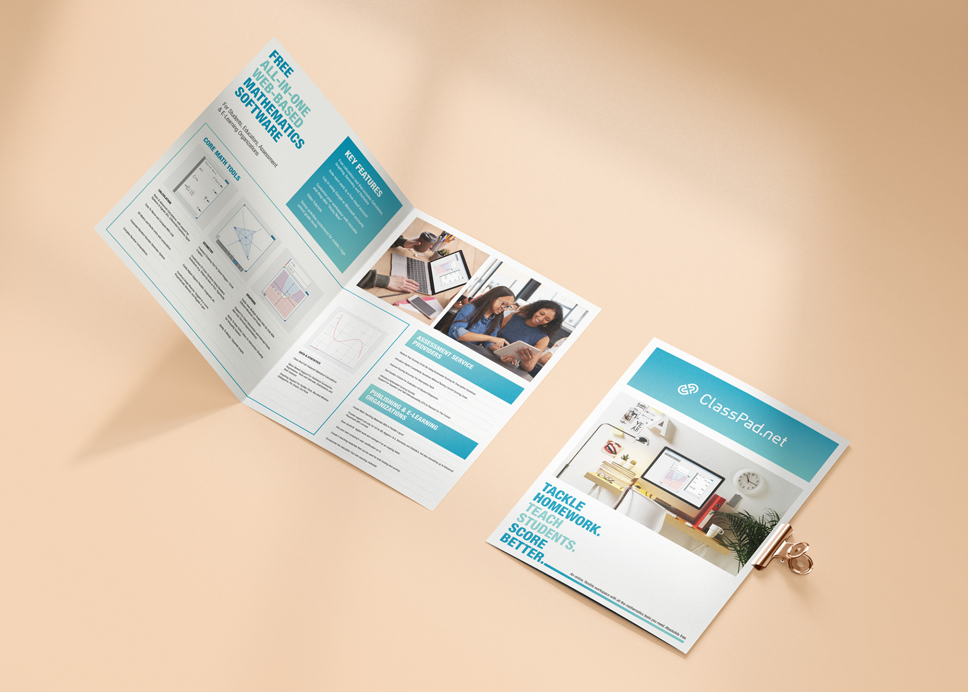 Bifold brochure advertising CASIO Education's new free online mathematics software, ClassPad.net